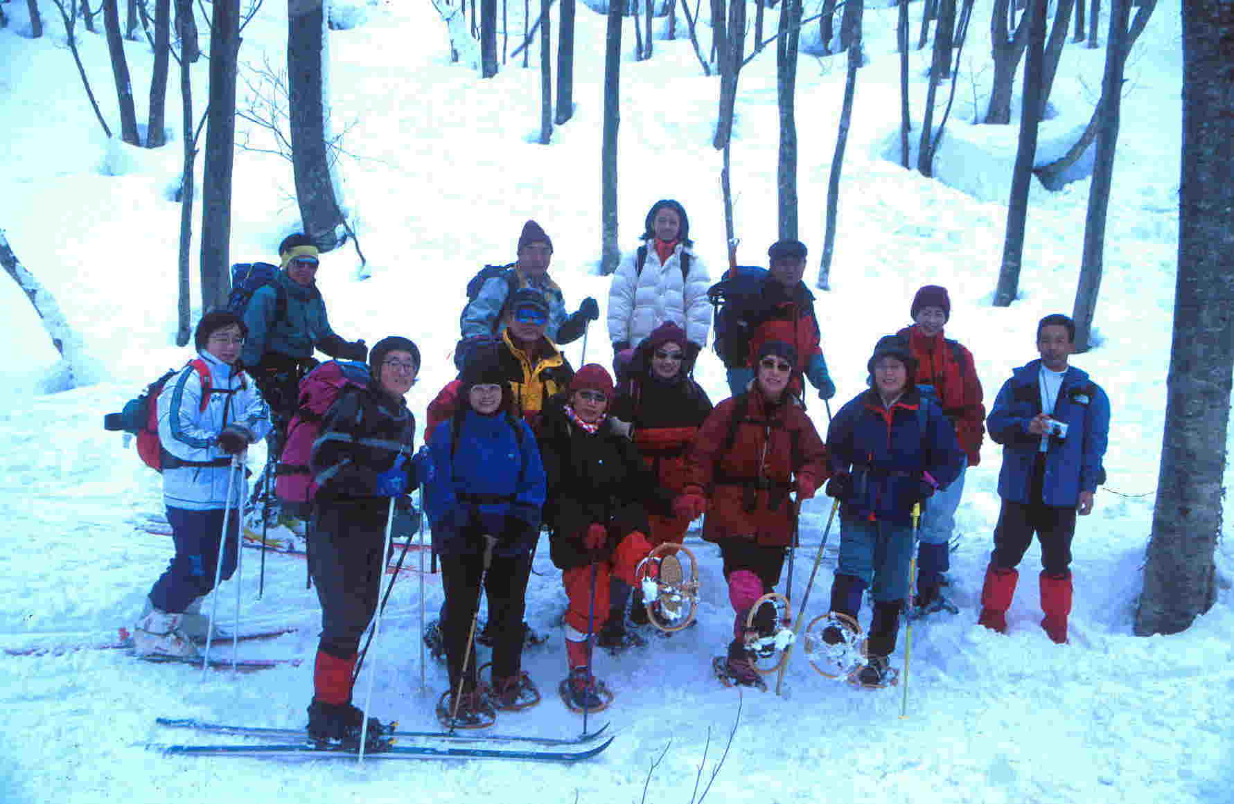 | 記念すべき2000年最初の観察会は、厳冬期2月6日の日曜日、奥羽線峠駅周辺で行われました。お天気はまずまず。ふかふかの新雪を期待していたものの、溶けだし気味の3月下旬のような雪質は、穏やかな空模様と相まって春到来といった雰囲気で、地吹雪ツアー的観察会を期待していた参加者の方は調子が狂ったことと思います。 峠駅前に集合した後、旧駅舎ホーム跡から栂森に続く尾根に取り付き、200mほど登ったところの雑木林を目指しました。途中、長靴の人はかんじきを付けましたが、かんじきを履くのは初めての人が多く、最初は歩きにくそうでしたがすぐに慣れ、その威力を活かして楽しく歩き回っていました。30分ほど登ったところで、尾根の傾斜がゆるんだ台地場の場所をベースにしてあたりを歩き回りました。今回の観察会のメニュー、アニマルトレッキングでは見つけたのはウサギの足跡のみでした。それでもしばらく追いかけると、複数羽が入り乱れたような跡があったり、トイレがあったりと、そこでウサギがどのように行動したのかみんなで色々想像して楽しみました。もう一つのメニューである雪洞掘りは雪が少なく実現しませんでしたが、木の根本を利用して簡易なシェルターを掘ることなど簡単なビバーク方法について学びました。 |