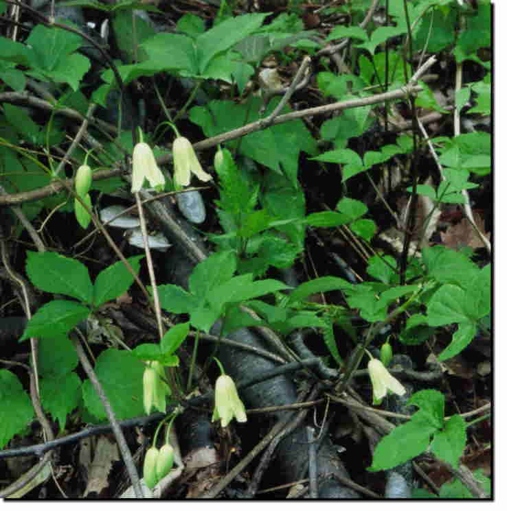 山地や丘陵地の林縁に生える落葉蔓性低木。「ハンショウヅル」とは、火事を知らせるために鳴らした小形の釣鐘(これを半鐘という)に花の姿を見立てたもの。本種は高知県の鳥形山(1460m)で発見されたため、地名を冠して名づけられた。なお半鐘は、昭和40年代頃までは各集落に必ずあった雨ざらしの火の見やぐらのてっぺんに着けられていた。当時は、この半鐘を鳴らしてみたくて登って大人たちに怒られた腕白がどこにでもいたはずである。 葉は3枚の小葉からなる三出複葉で葉序(葉の着きかた)は対生で茎の同じ場所から、2枚対で葉が発生する。花は腋性で葉腋から2〜3個の釣鐘状の花を下向きに咲かせる。花弁は無く、花弁の様に見えるものは「ガク片」で、外側には毛が生えている。花は多数の雌しべを有毛の雄しべが囲み,更に黄白色〜淡緑色の4枚のガク片が雨風を避けるマントのように包み込む構造となっている。属名が示すように園芸種で人気の高い「クレマチス」の仲間である。ハンショウヅルの仲間ではミヤマハンショウヅルのみが例外的に花弁をもつ。 「レッドデータブックふくしま」に絶滅危惧種U類として掲載されている「アズマハンショウヅル」はハンショウヅルの変種で中部地方から東北に植生するとされていたものである。しかし、花柄に小包がない等トリガタハンショウヅルと実質的な形態の差異は無く(図鑑記載では花柄の長さのみ)、近年では「アズマハンショウヅル」もトリガタハンショウヅルとして統一する見方が有力となっているようである。「高山の原生林を守る会」の中吾妻観察会(2000年)で本種に遭遇し、会員の間でも話題になったが、最近、高山山麓近郊でも会員の山内幹夫氏によって群落植生が確認されている。 |